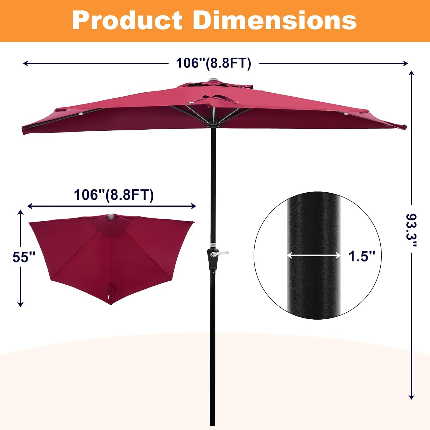 • User-Friendly Design:A crank handle allows for easy opening and closing—simply turn the handle to adjust the 9 foot patio umbrella to the desired position. The top vent promotes airflow, allowing cool air to circulate.
