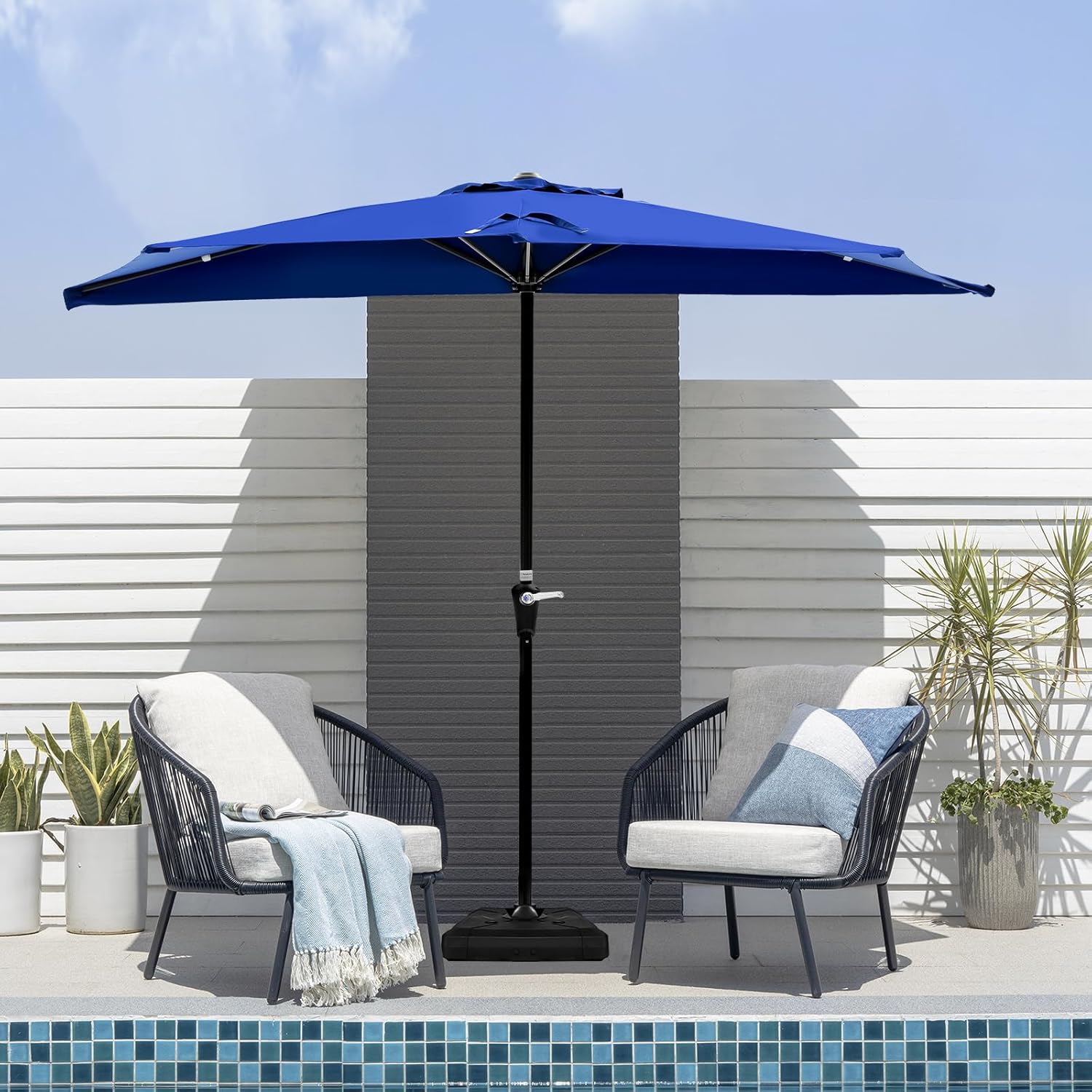• Easy Assembly: No tools are required for setup. Detailed instructions are included for straightforward step-by-step assembly.Note: The base is not included with the heavy duty patio umbrella. A base weighing 55 lbs (25 kg) or more is recommended for stability.