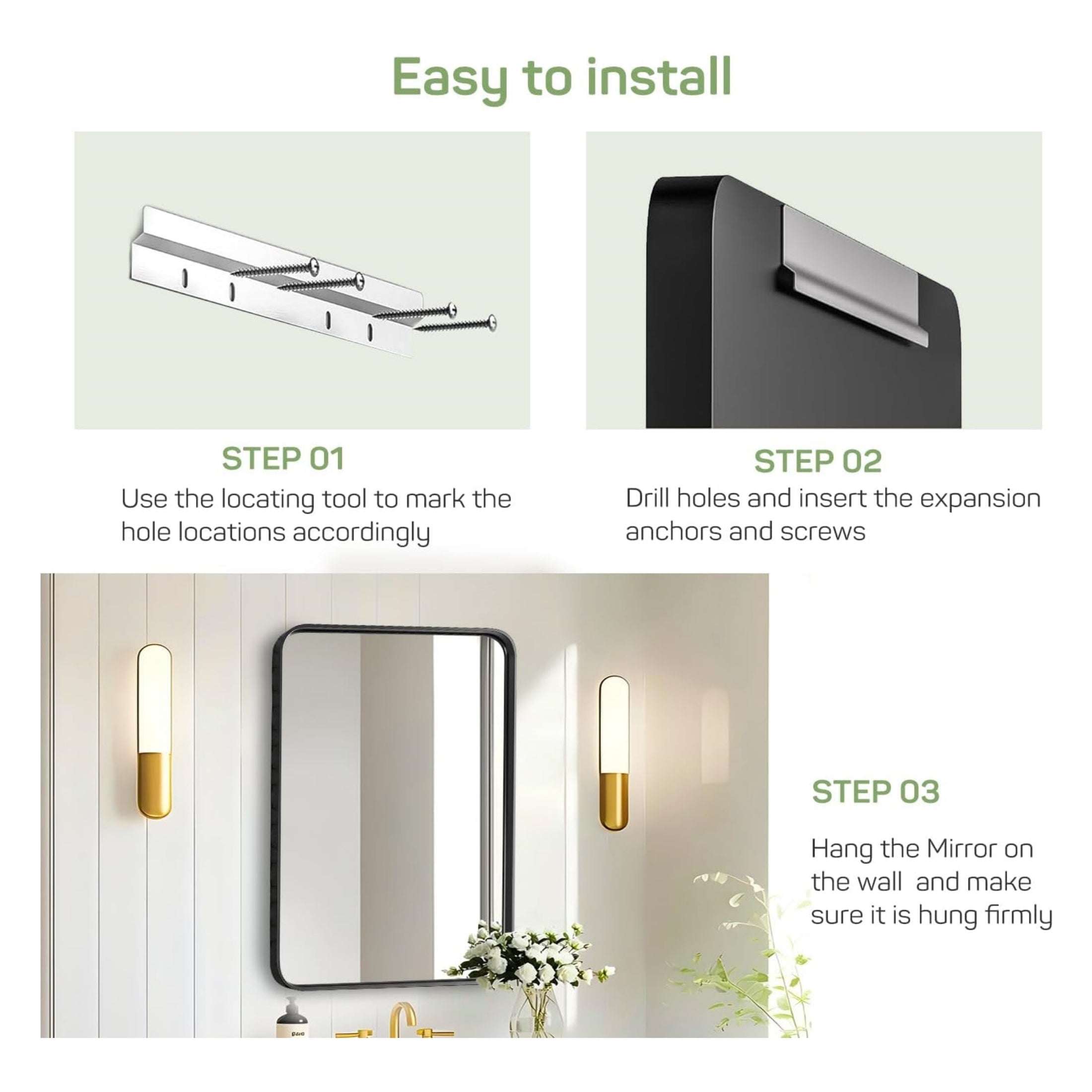 Multiple Hangs Modes - The matte frame mirror can be mounted vertically and horizontally, and with its modern decorative, it can be used in a variety of scenarios, suitable for use in bathroom, vanity, farmhouse, bedroom, living room, dining room, entryway, fireplace, corner.