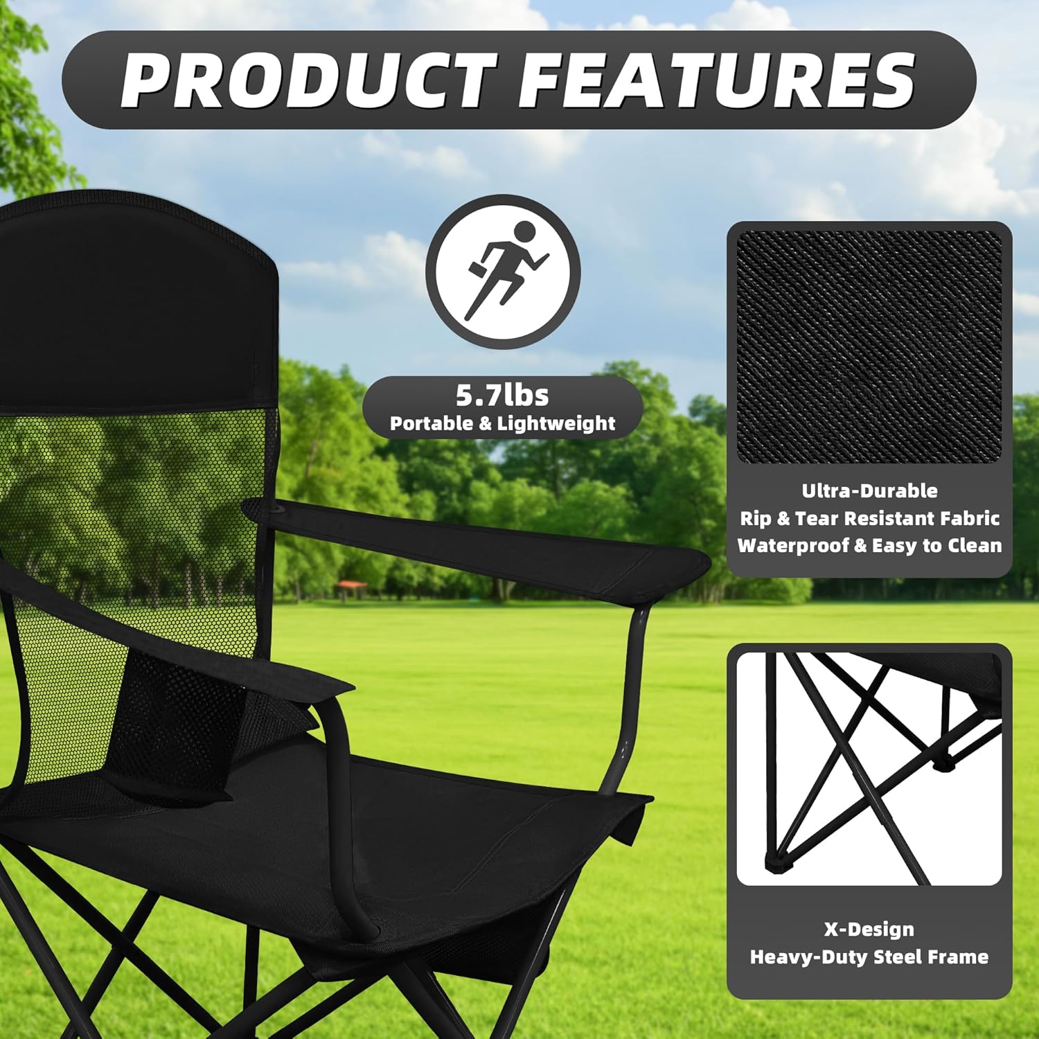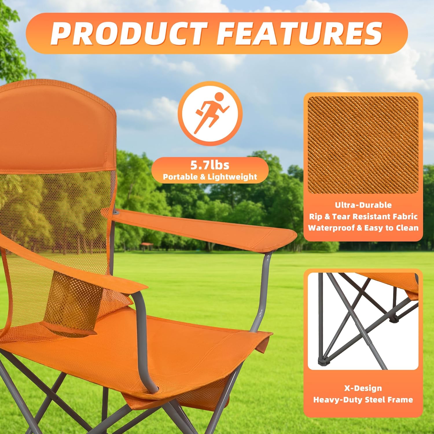 • 【Waterproof & Easy to Clean Fabric】The waterproof seat material resists spills and light rain and wipes clean in seconds. Ideal as a beach chair or outdoor seating option, it stays fresh and low maintenance after camping, fishing, or beach days.
