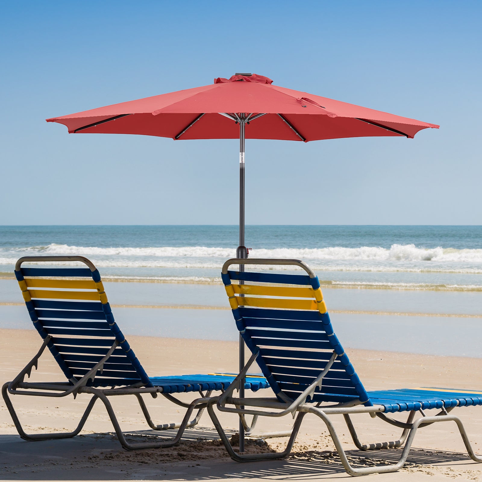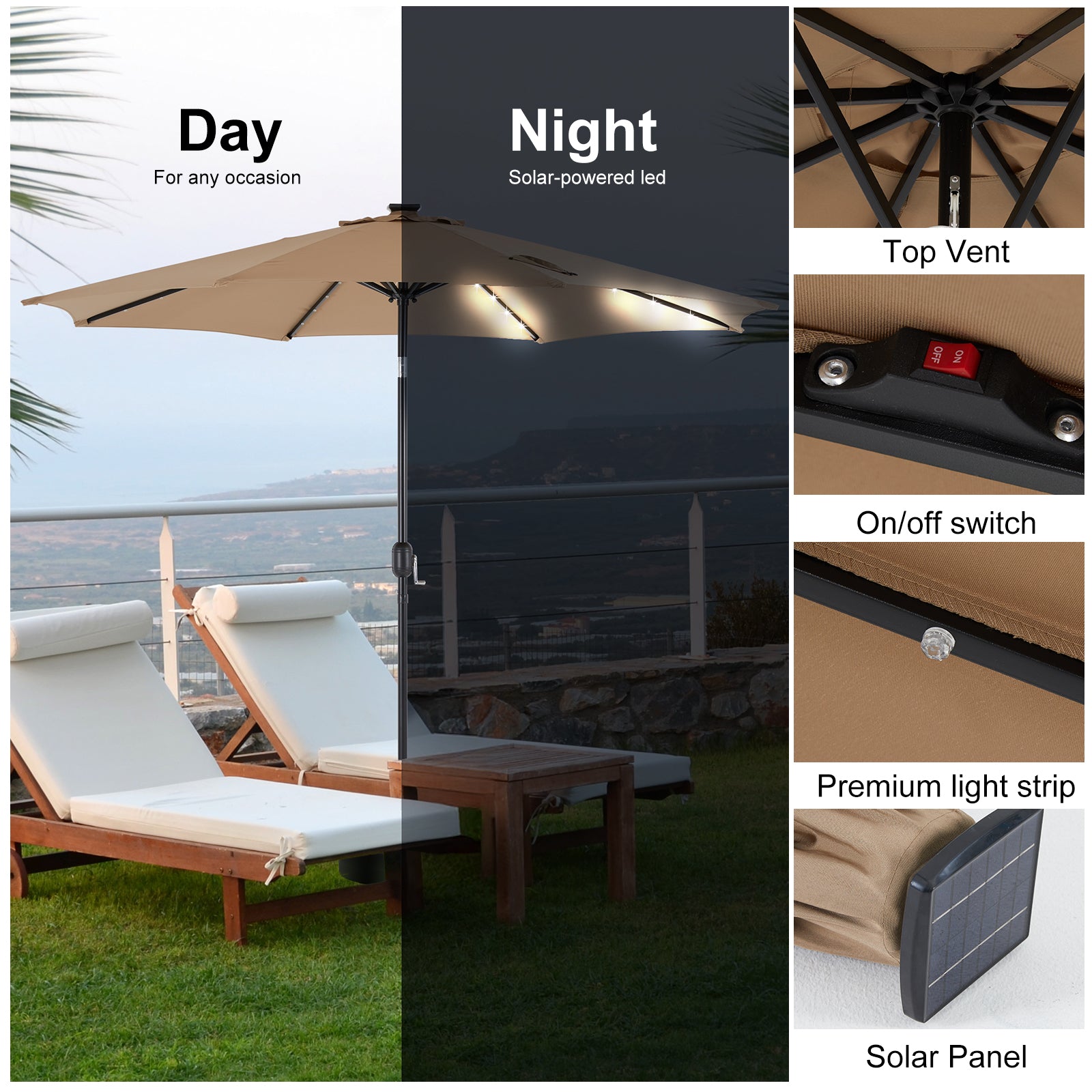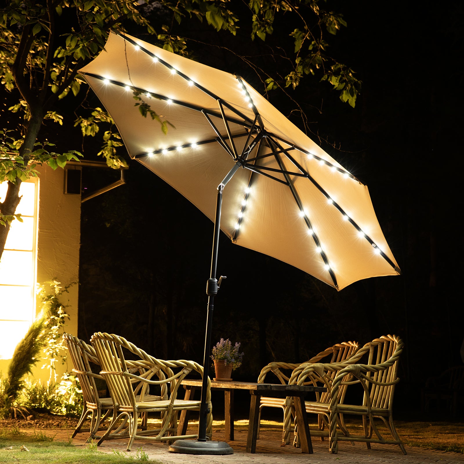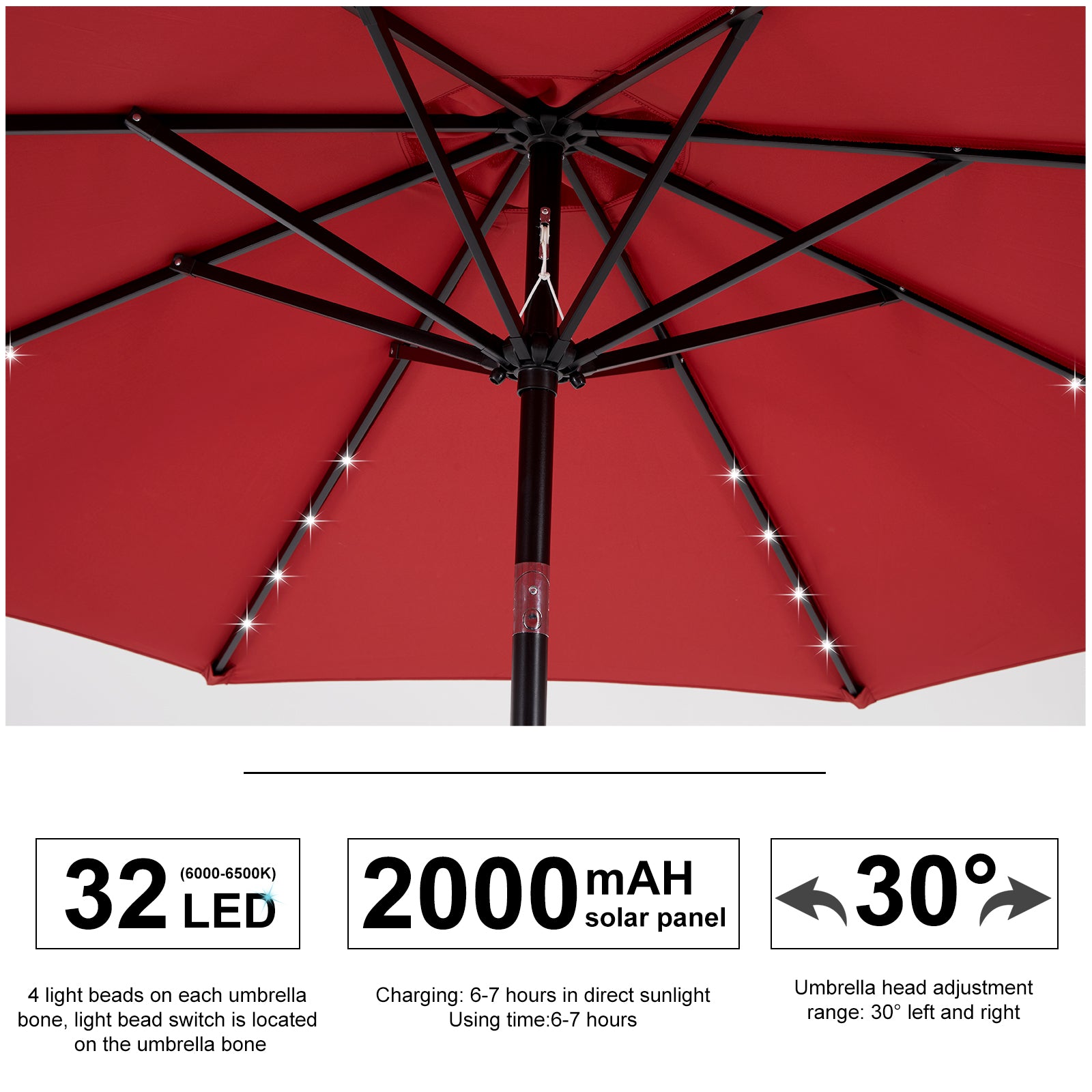 • 【Energy-saving Design】The outdoor table umbrella is equipped with 32 solar-powered LED lights. There are 8 iron ribs construction and 4 LED lights on each rib. Solar panel capacity is 2000mAH. Once the battery is fully charged, the solar power will last for 6-7 hours. The patio umbrella with solar lights can provide you with shade during the day and light up relaxing evenings, creating a warm atmosphere.